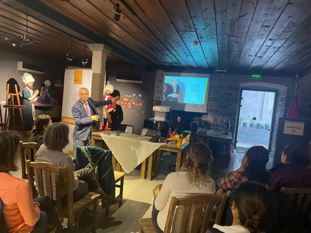 Ertekin, Deniz Fenerleri serisi içinde araştırmalarını topladığı “Fatma Melahat Aksoy” kitabından aktardığı anekdotlarla renklendirdiği konuşmasının sonunda İzmir İl Milli Eğitim Müdürü Dr. Ömer Yahşi tarafından hazırlanan teşekkür belgesi Öğretmen Akademileri koordinatörü Eser Arık Dereli tarafından verildi.